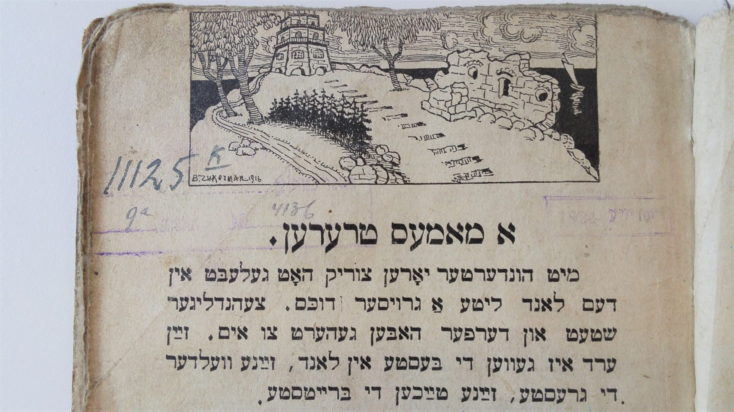 Nacionalinė biblioteka saugo ne mažą dalį vaikiškų knygelių, periodinių leidinių leistų tarpukario laikotarpiu. Šiandien mes jums pristatome vaikams skirtą knygelę, jidiš kalba, kuri buvo išleista 1916 metais, Vilniuje. Pasakojimas prasideda taip: „Prieš šimtą metų Lietuvos žemėje gyveno puikus karalius, kuris valdė ištisus miestus ir kaimelius. Jo laukai buvo derlingiausi krašte, miškai – didžiausi, upės – plačiausios.“ Šiam pasakojimui būdingas lietuviškasis kontekstas, vienoje iš iliustracijų galima įžvelgti Gedimino bokšto leitmotyvą (pav. 1).