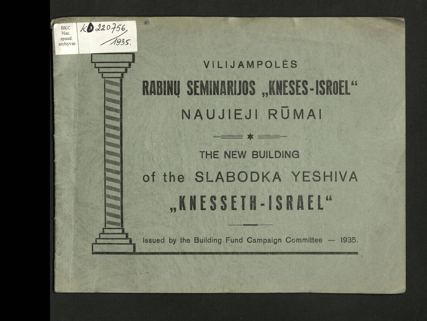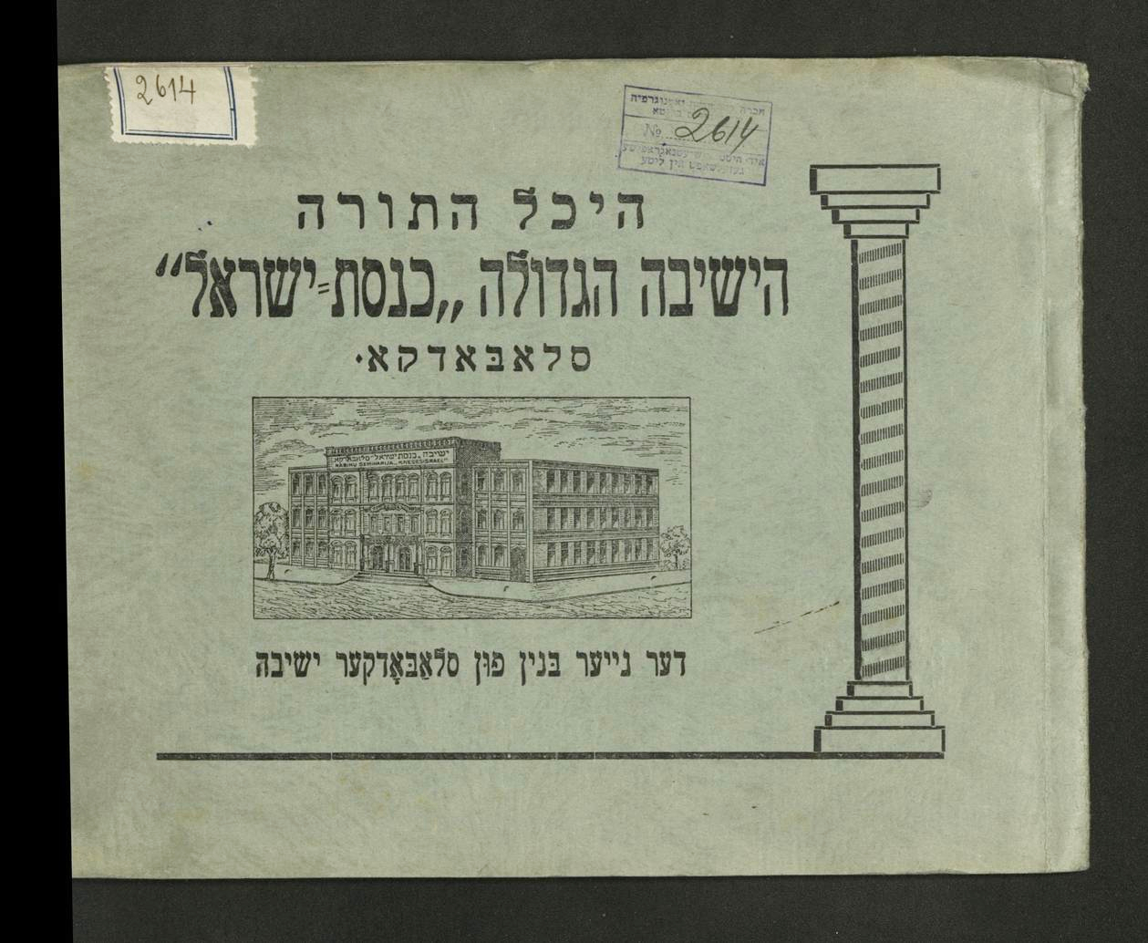 Leidinys „Vilijampolės rabinų seminarijos Kneses Isroel naujieji rūmai“. LNB Judaikos kolekcija