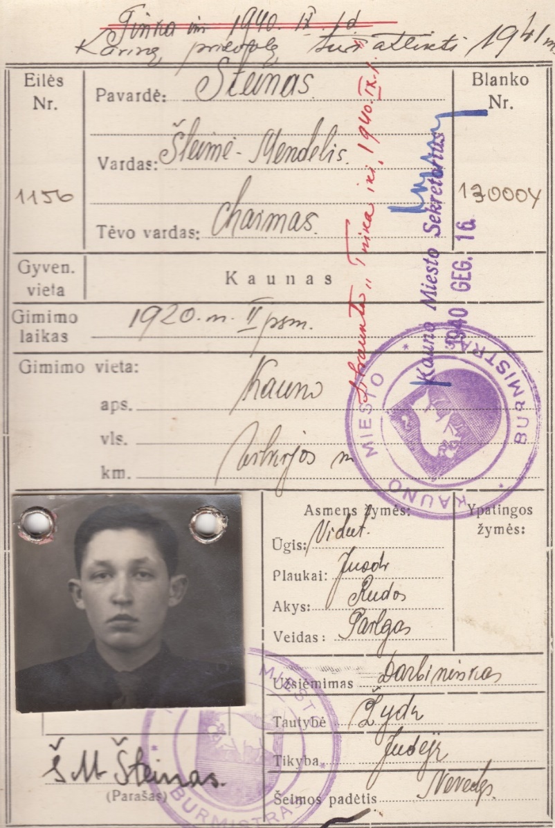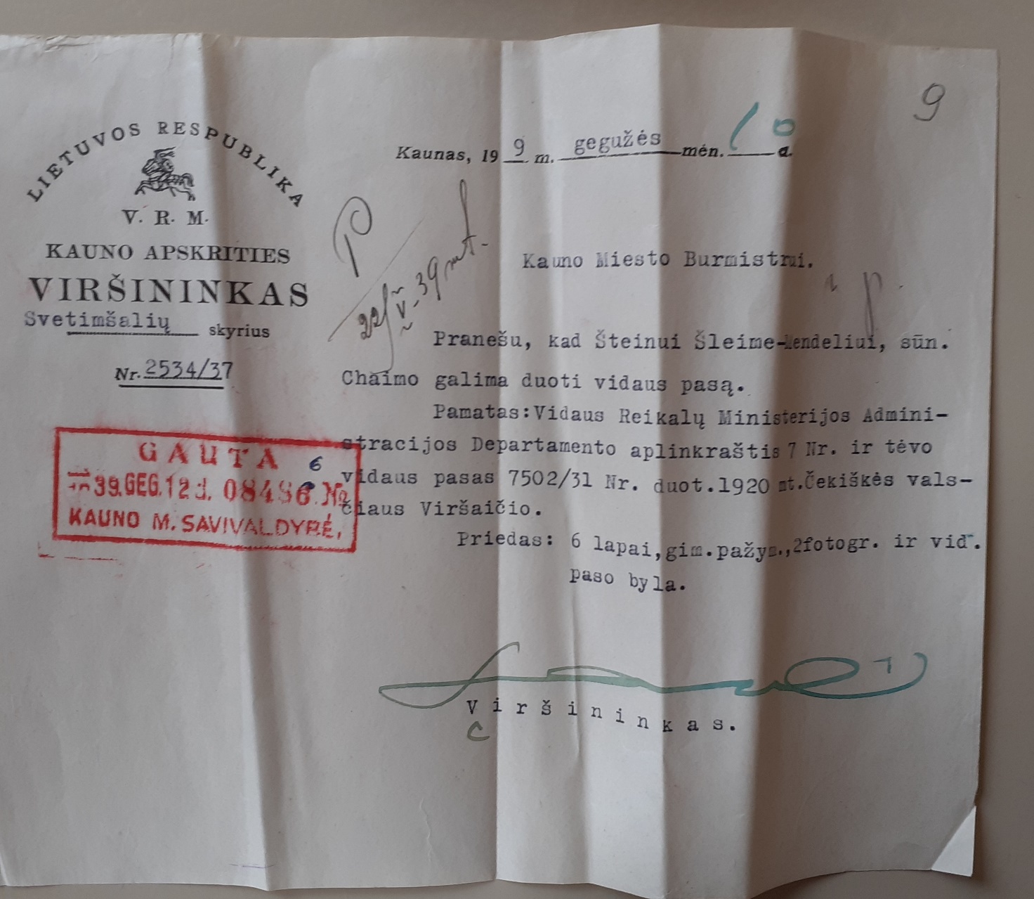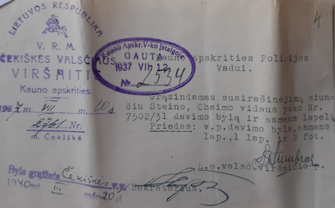 Gegužės 10 d. Kauno apskrities viršininkas rašo Kauno miesto burmistrui, kad Šteinui Šleimei-Mendeliui, Chaimo sūnui, galima išduoti vidaus pasą. Pagrindas – Vidaus reikalų ministerijos administracijos departamento aplinkraštis Nr. 7 ir tėvo vidaus pasas, išduotas Čekiškės valsčiaus viršaičio.