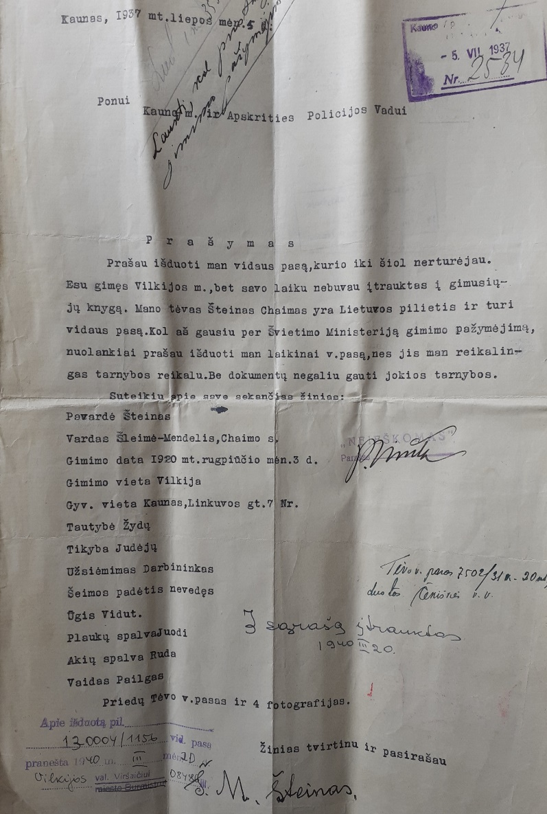 Iš šio prašymo jau žinome ne tik pilną vardą, taip, kaip jį pats žmogus rašė, bet ir tai, kad 1937 m. Š. M. Šteinas nebegyveno – bent jau oficialiai – Ramonų vienkiemyje, nurodytas adresas – Vilijampolėje, tuo metu jau tapusioje Kauno priemiesčiu, Linkuvos g. 7.