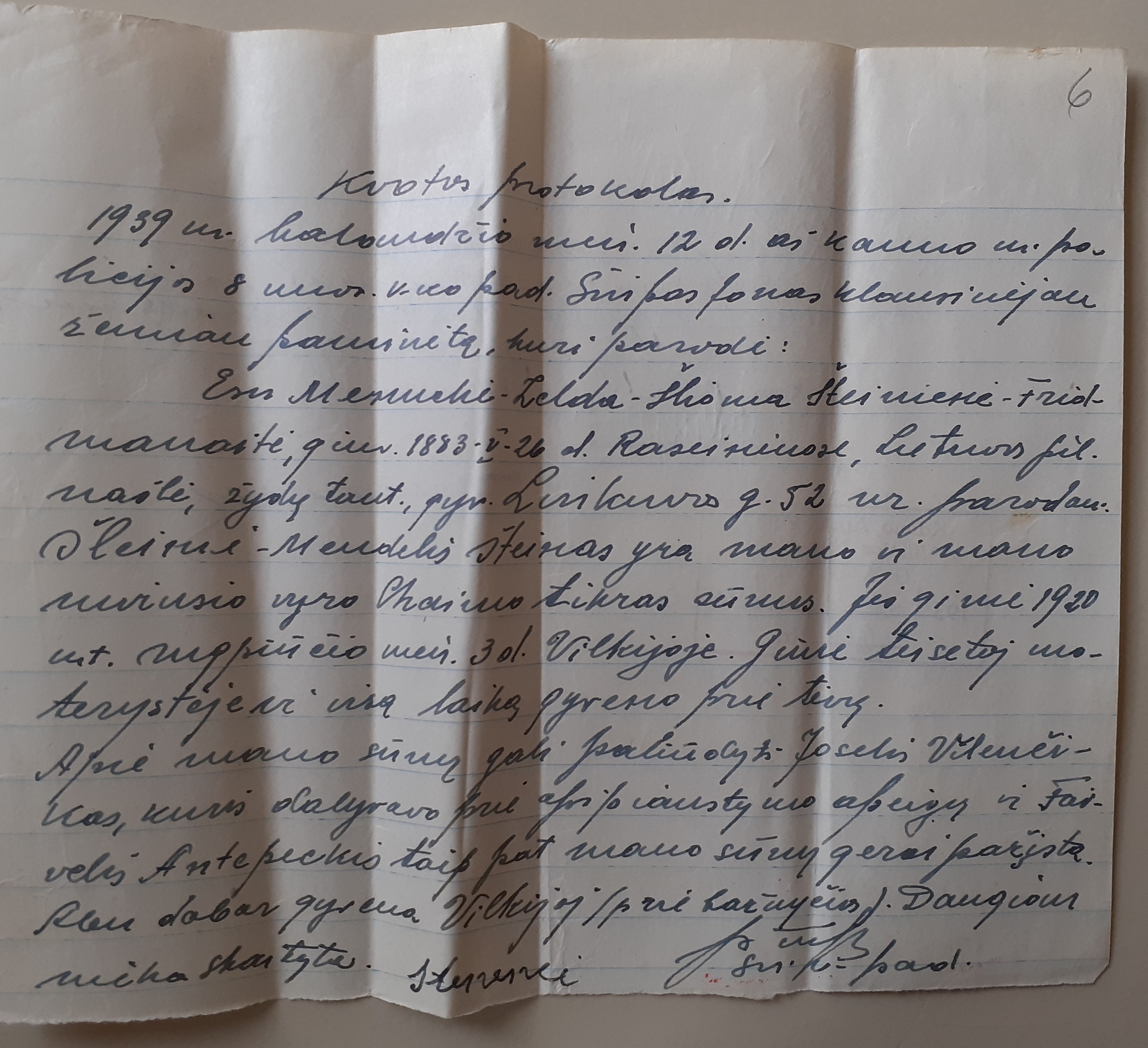 „Esu Menuchė-Zelda, [Šliomo]11, Šteinienė Fridmanaitė, gim. 1983 V 26 d. Raseiniuose, Lietuvos pil. našlė, žydų taut., gyv, Linkuvos g. 52 ir parodau: Šleimė-Mendelis Šteinas yra mano ir mano mirusio vyro Chaimo tikras sūnus. Jis gimė 1920 mt. Rugpjūčio mėn. 3 d. Vilkijoje. Gimė teisėtoj moterystėje ir visą laiką gyveno prie tėvų. Apie mano sūnų gali paliūdyti Joselis Vilenčikas, kuris dalyvavo prie apipjaustymo apeigų ir Faivelis Atupickis taip pat mano sūnų gerai pažįsta. Abu dabar gyvena Vilkijoje (prie bažnyčios)”12.