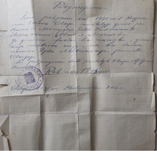 „Jo gimimo faktas liko neįrašytas į gimusiųjų metrikų knygas, nes tuo laiku neveikė Žydų Metrikacijos punktas Vilkijoje. Šis pažymėjimas duota pristatyti Vilkijos Apylinkės teismui”8.