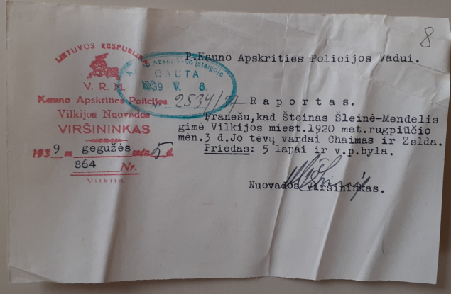 Pagaliau 1939 m. gegužės 5 d. Kauno apskrities policijos Vilkijos nuovados viršininkas rašo Kauno apskrities policijos vadui raportą, kuriuo praneša, kad Šteinas Šleinė (iš tikrų Šleimė)-Mendelis gimė Vilkijos mieste 1920 m. rugpjūčio 3 d., jo tėvų vardai – Chaimas ir Zelda (iš tikrųjų Menuchė-Zelda), prideda kvotos lapus ir vidaus paso bylą.