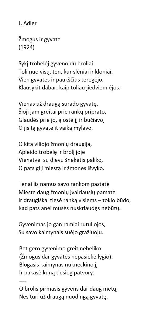 Kviečiame susipažinti su eilėraščiu, kurį parašė iš Galicijos batsiuvio šeimos kilęs, išvykęs į JAV ir ten tapęs nepaprastai produktyviu literatu Jakobas (Jankevas) Adleris (1874-1974). Jis rašė satyrą, kūrė teatro pjeses, išleido kelias eilėraščių rinktines ir redagavo kultūrinius laikraščius. O šis humoristinis ir pamokomas eilėraštis įdomus tuo, kad atskleidžia žydų mitologijai gana neįprastą požiūrį į gyvates.