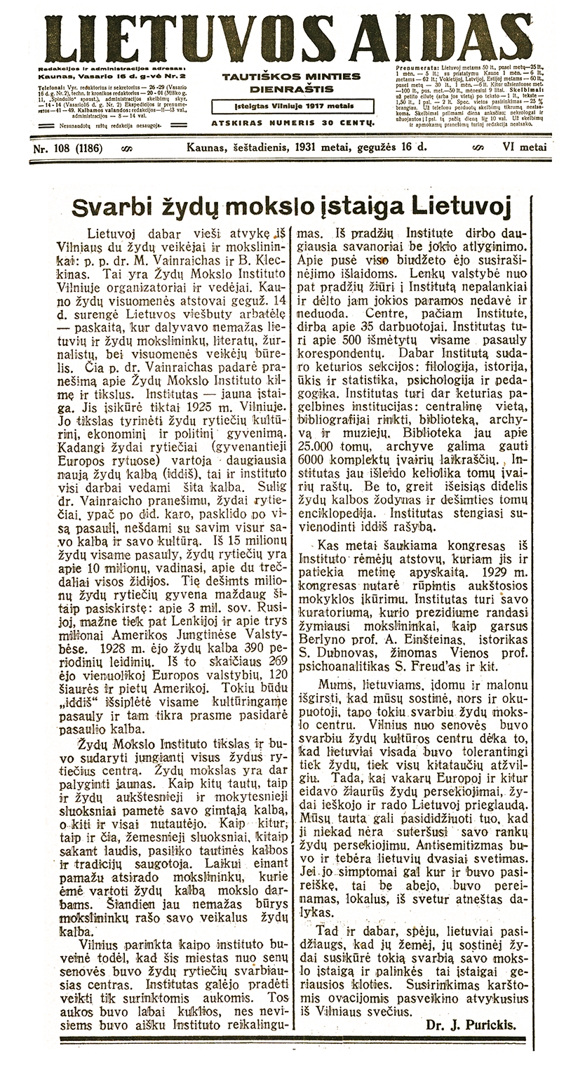 Reikia pridurti, kad Vilnius žydų pasaulyje visuomet asocijavosi su mokslo žiniomis. Juk tarp litvakų buvo posakis: „Oyb ir darfn gelt, geyn tsu Lodzh, oder oyb ir darfn khokhme – geyn tsu Vilne“ – „Jei Jums reikia pinigų, vykite į Lodzę, o jei jums reikia išminties, vykite į Vilnių“. Kaip aiškino Maksas Vainraichas 1935 m., kodėl pasirinktas Vilnius: „Vilnius pasižymi privalumu, kurio neturi joks kitas miestas. Žydiškoji tradicija čia jungiasi su žydiškąja modernybe. Tik iš šių dviejų elementų jungties galima kurti žydiškosios kultūros ateitį“.