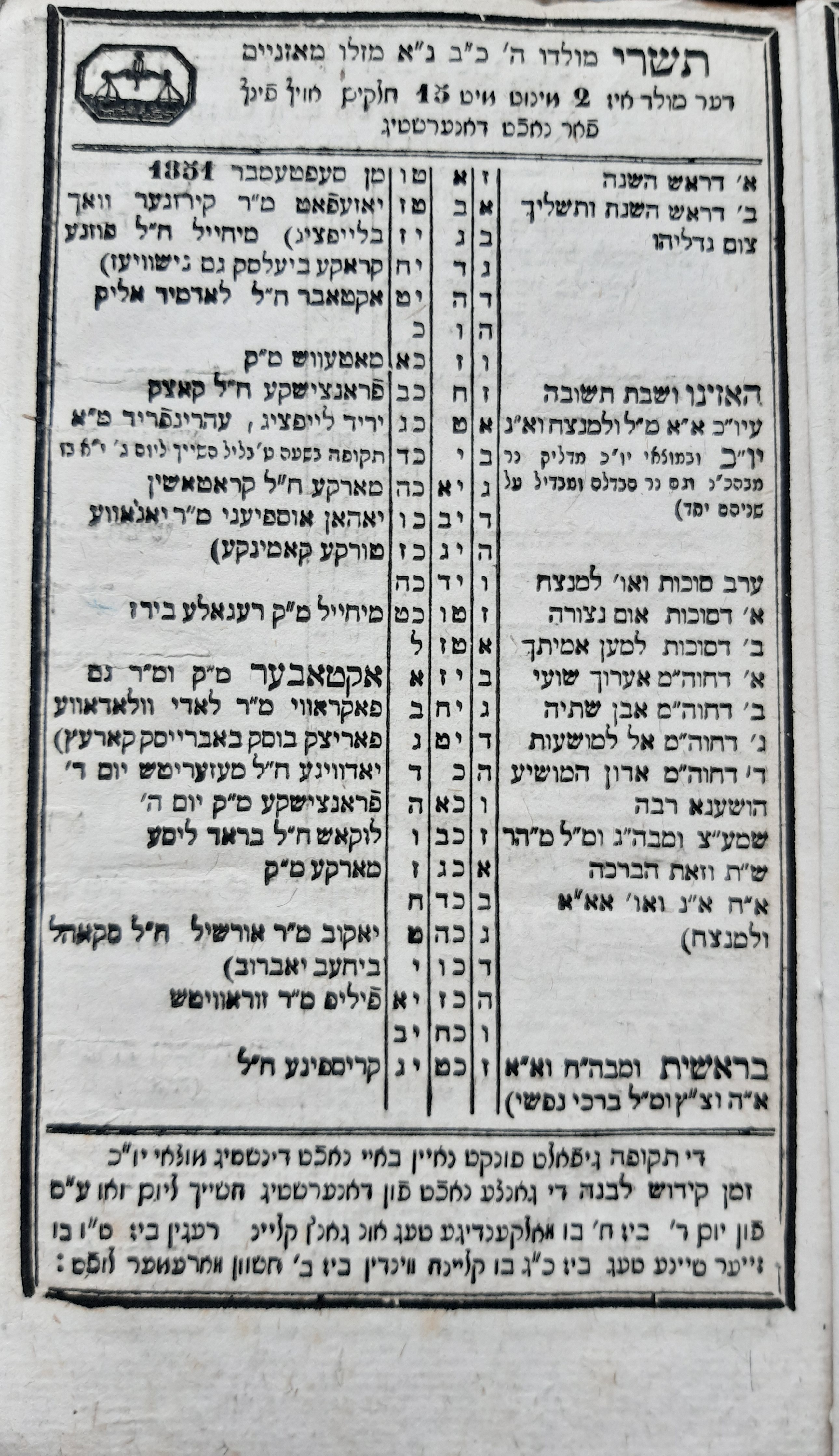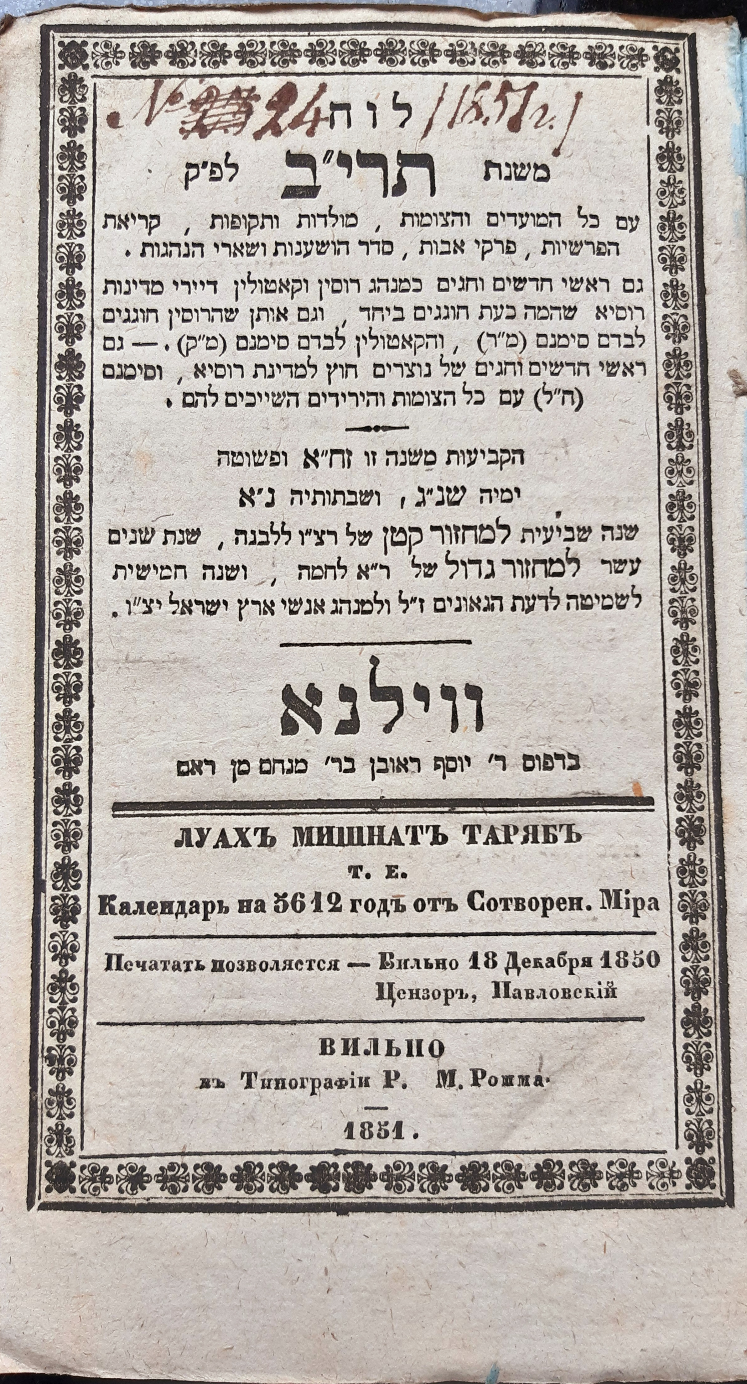 Žydų kalendorius 1851-1852 m. su tradiciškai, hebrajų raidėmis, užrašyta data ir rudens švenčių mėnesiui – tišrejui skirtas puslapis : 5612. Vilnius, Romų spaustuvė, 1851. LNB Judaikos kolekcija.
