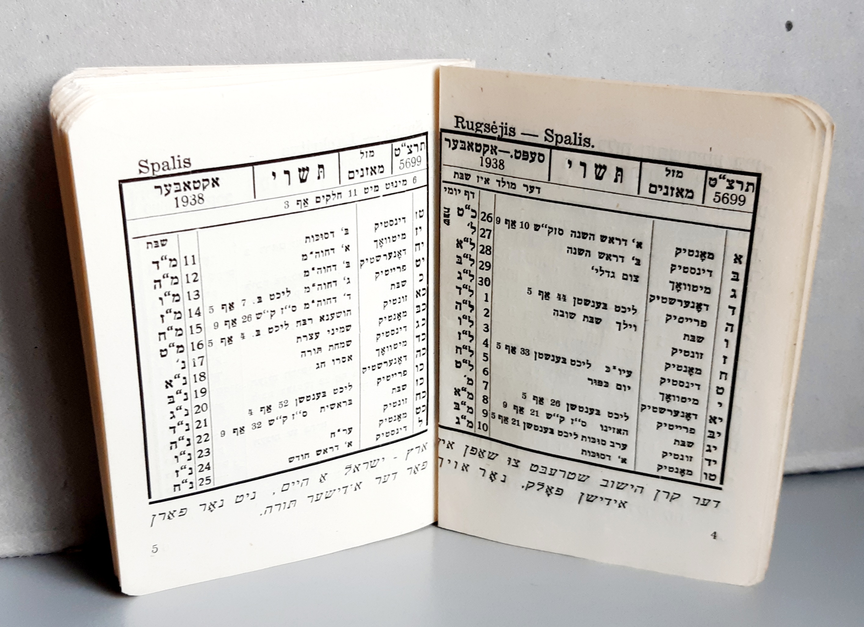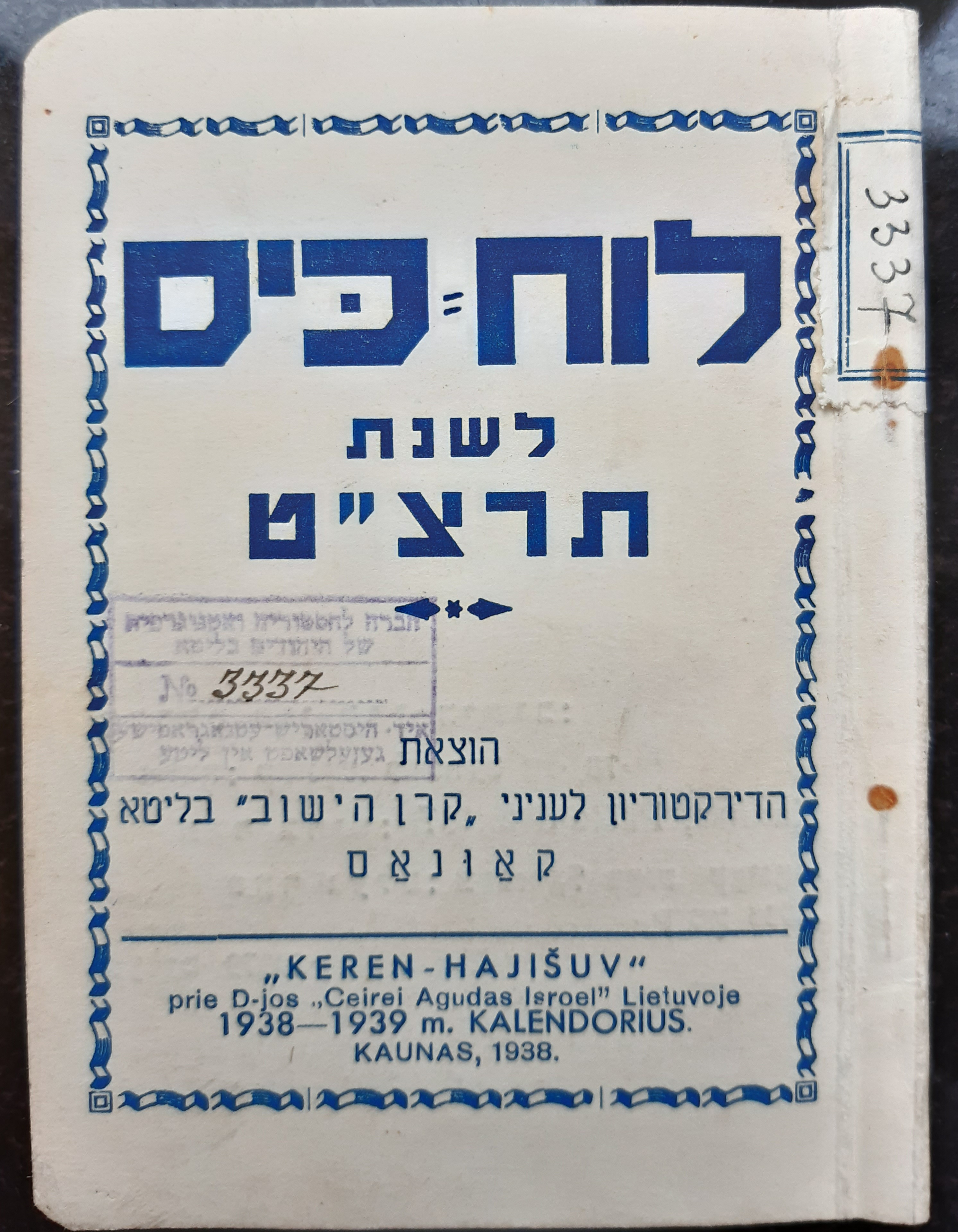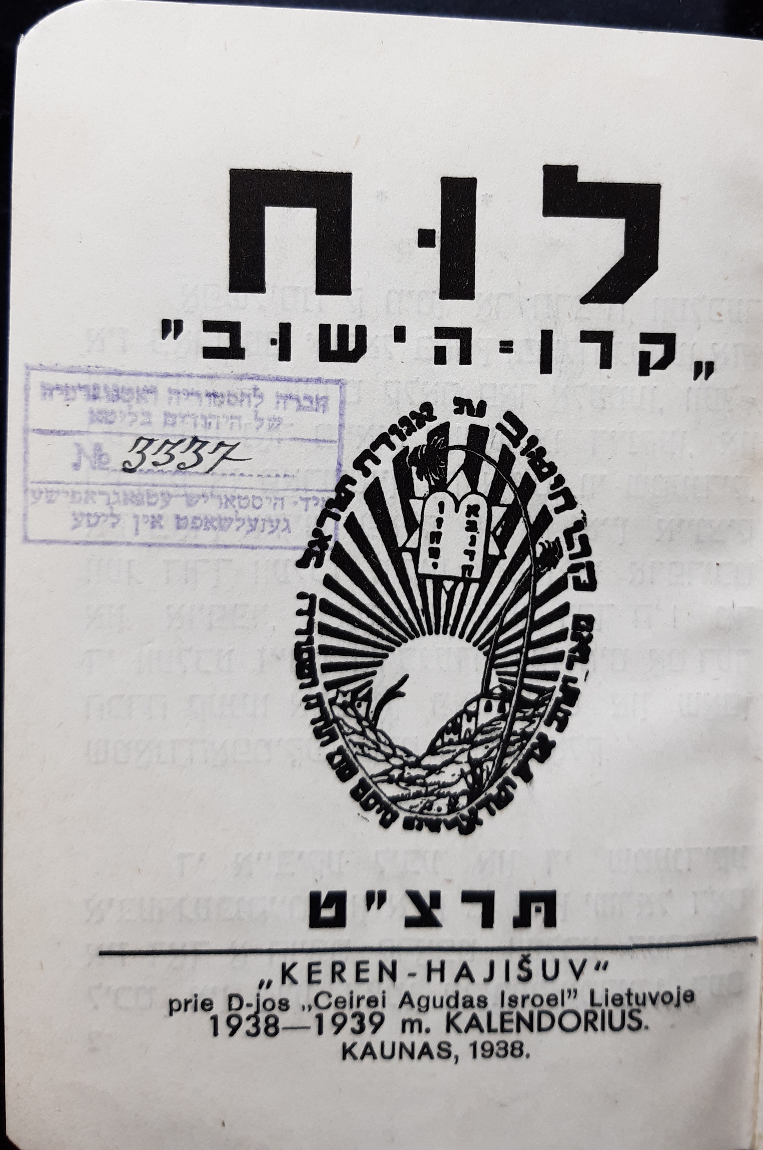 Lietuvos žydų ortodoksų jaunimo organizacijos „Tseire Agudat Israel“ kišeninis kalendorius 1938-1939 m. Kaunas, S. Joselevičiaus spaustuvė, 1938. Iš Lietuvos žydų istorijos ir etnografijos draugijos archyvo. LNB Judaikos kolekcija.