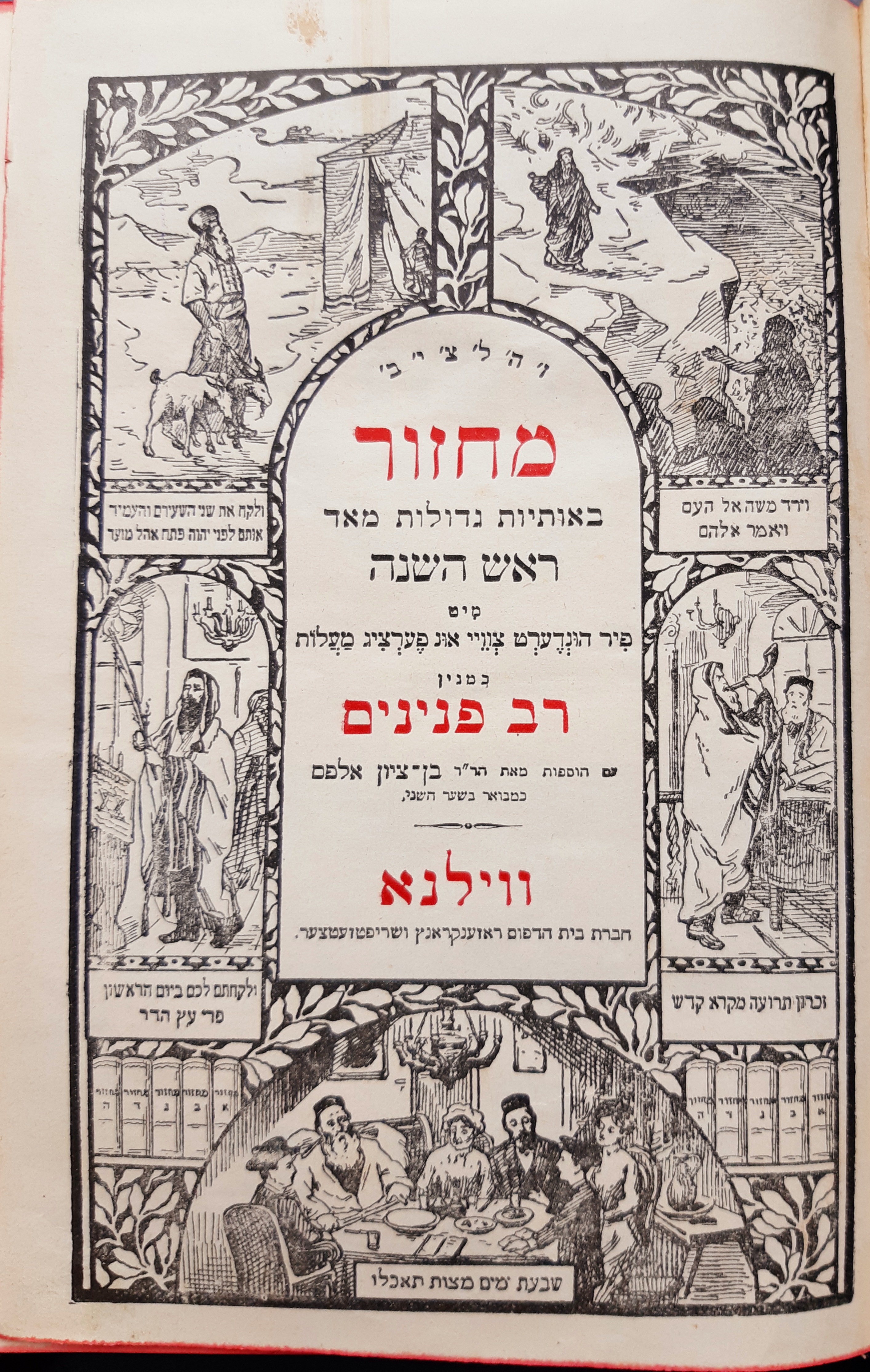 Machzoras (šventinis maldynas) Roš Hašana pamaldoms. Tituliniame lape – rudens švenčių: Roš Hašanos, Jom Kipuro ir Sukoto vaizdai. Vilnius, A. Rozenkranco ir M. Šriftzecerio spaustuvė, 1936. LNB Judaikos kolekcija.
