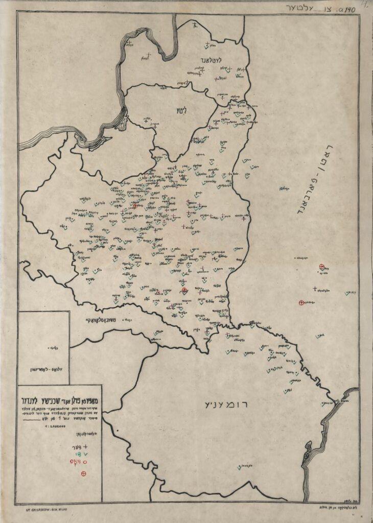 Koridoriuje ant sienų kabėjo įvairūs žemėlapiai: žydų paplitimo pasaulyje, YIVO filialų. Vienas žemėlapis ypač patraukė mūsų dėmesį – jame parodyta, kaip skirtinguose regionuose tariami artikeliai. Pavyzdžiui, Pietų Lenkijoje neutrali giminė vartojama taisyklingai, o Šiaurės Lenkijoje – su klaidomis.