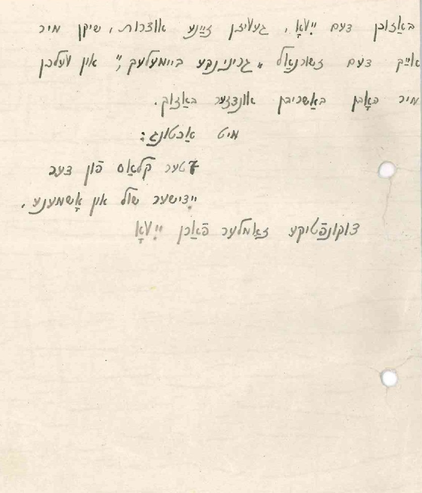 Iš teatro muziejaus perėjome į folkloro kambarį. Čia jis skaitė mums įvairias surinktas pasakas, anekdotus, prietarus ir kitą jidiš folkloro medžiagą. Matėme ir Motkės Chabado[3] nuotrauką.