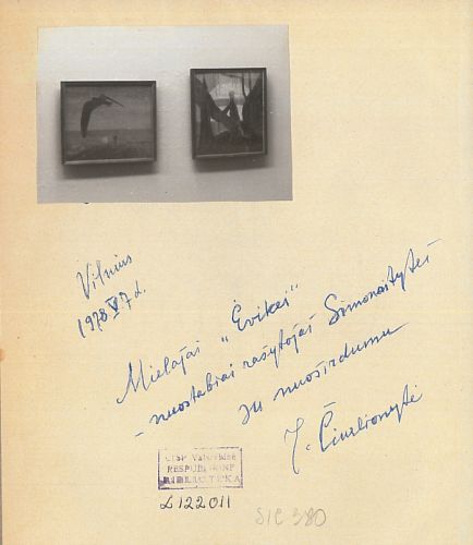 Rašytoja turėjo muzikologės Jadvygos Čiurlionytės parengtus „Atsiminimus apie M. K. Čiurlionį“ (1970). Knygos autorė įrašė šiltą dedikaciją: Mielajai „Ėvikei“ – nuostabiai rašytojai Simonaitytei su nuoširdumu J. Čiurlionytė Vilnius 1978. V. 7 d. Leidinio antrajame puslapyje yra įklijuotos dviejų M. K. Čiurlionio paveikslų nuotraukos[8]. Minėta knyga svarbi tuo, kad tai tikriausiai buvo paskutinė Simonaitytei dovanota knyga su dedikacija. Po trijų mėnesių rašytoja mirė.