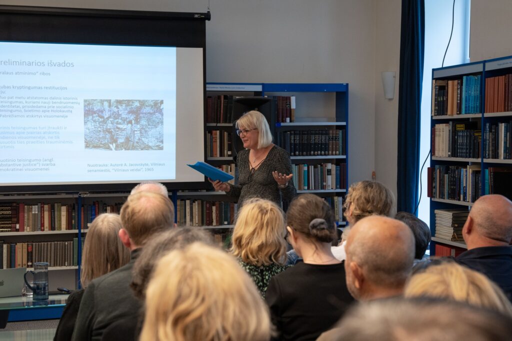Pirmadienio vakarą į Vilniaus žydų viešąją biblioteką susirinko ypatingai daug lankytojų – istorikų, mokslininkų, tyrėjų ir kitų, kurie atvyko pasiklausyti įžvalgų iš prof. Neringos Klumbytės iš Majamio Universiteto (JAV) ir prof. Dovilės Budrytės iš Georgia Gwinnett College (JAV) atliekamo tyrimo apie Holokausto teisingumą Lietuvoje.